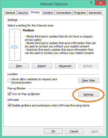 2) To allow pop-ups for this site, select the "Privacy" tab and then under "Pop-up Blocker" press "Settings"